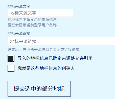 在页面最下方可以设置地标来源文字和地标来源链接。如果这些地标是你自己创建的,可以勾选 我就是这些地标信息的创建人,就不需要填写地标来源文字和链接了。如果不是,则需要填写并勾选 导入的地标信息已确定来源处允许引用。