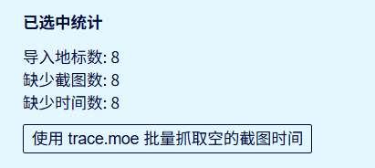 由于目前的设计限制,暂时不能手动为地标设置时间。请统一上传好截图之后,点击下方的 使用 trace.moe 批量抓取空的截图时间 按钮抓取时间。如果抓取不到时间或时间有误,可以提交后再单个修改(逃